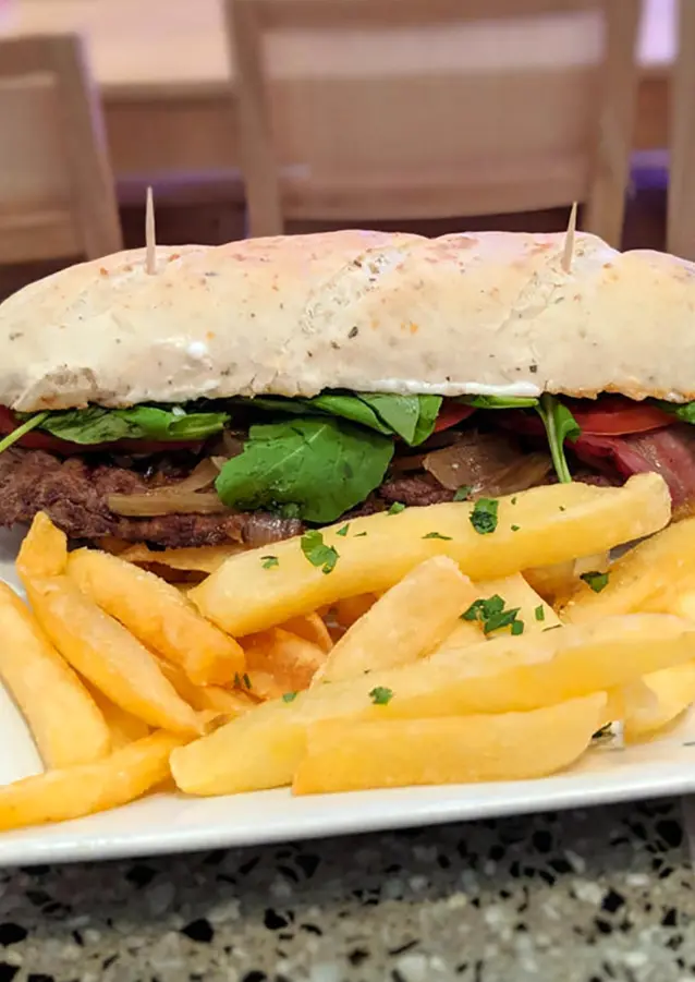 Una ensalada clásica con mezclum de lechuga mantecosa y lisa, aderezo cesar, pollo grillado, croutons ,panceta y parmesano.